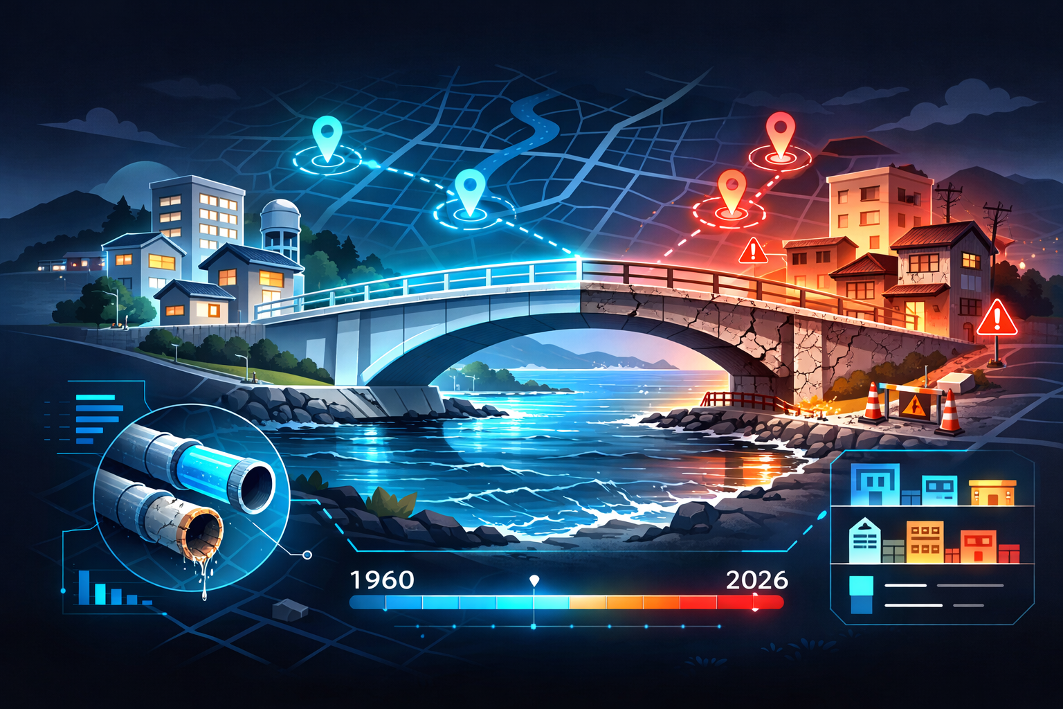 💡 ポイント: 12橋・8公共施設の老朽化状況を地図で一覧でき、水道管更新費用まで含む総概算額を試算表示します。