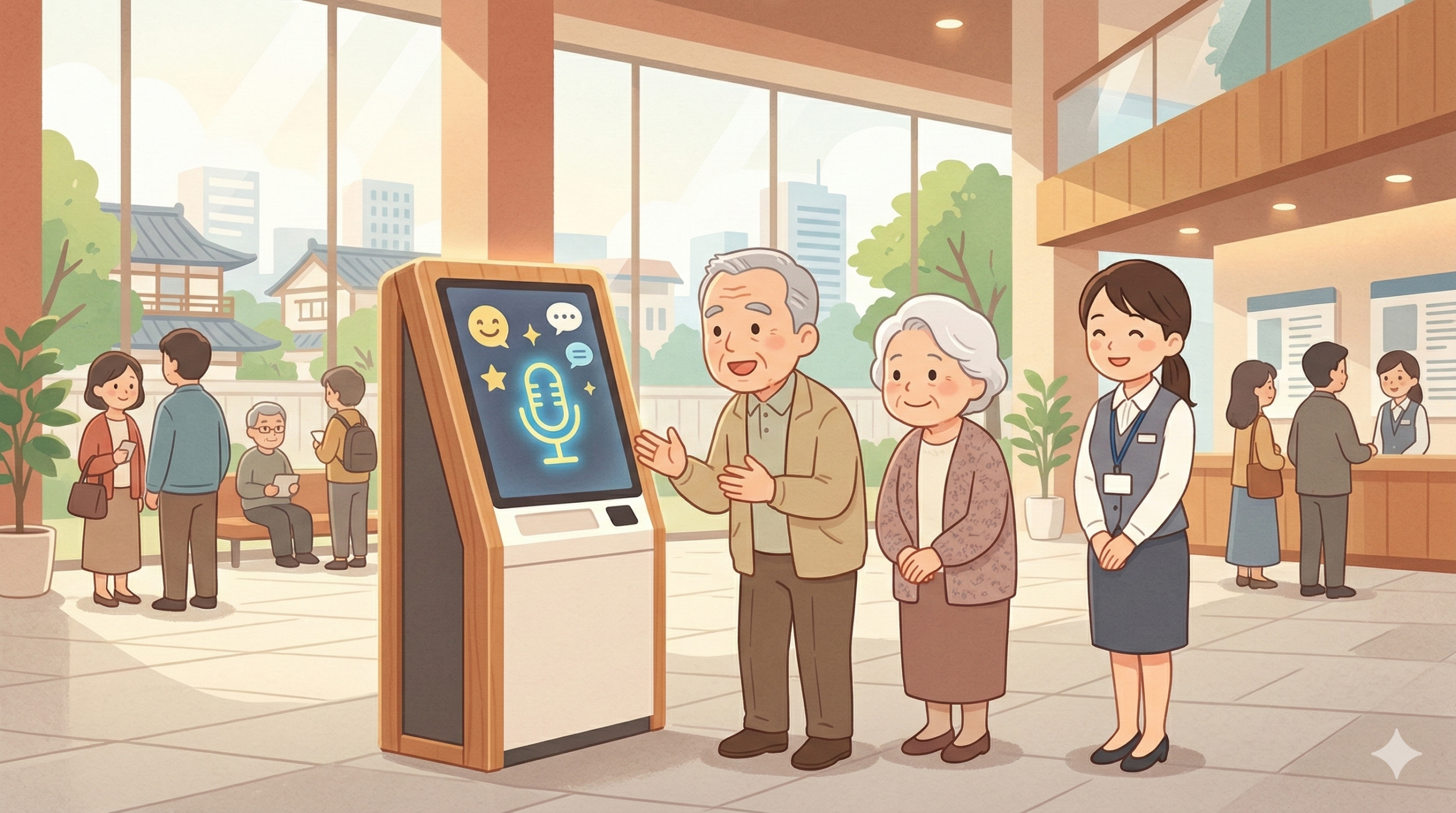 Web Speech APIの音声認識で質問をテキスト化し、行政手続きのナレッジベースから回答を検索します。回答は音声合成で読み上げ、同時に超大文字でテキスト表示します。フォントサイズは最小24pxに設定し、高コントラスト配色で視認性を確保。ボタンも大きく、タッチ操作しやすいデザインにしています。