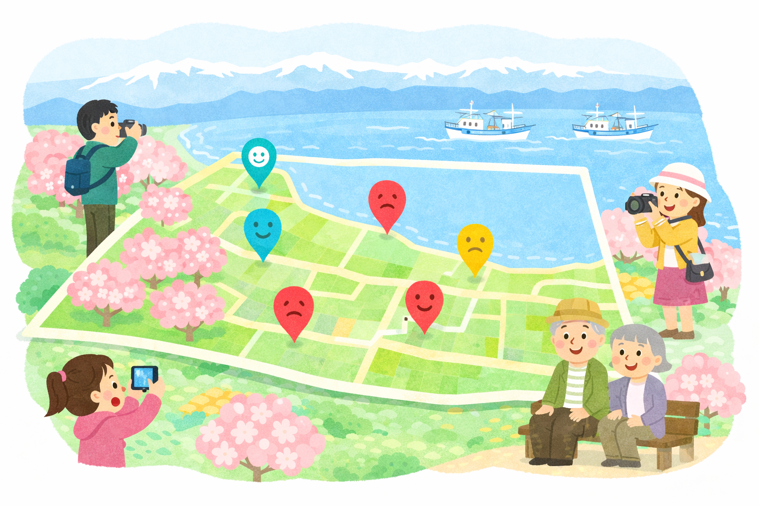 「絶景だった」「駐車場が混んでいた」——同じ観光地でも口コミはさまざま。感情スコアを地図で一覧すると、どのスポットが本当に満足度が高いかが一目でわかります。